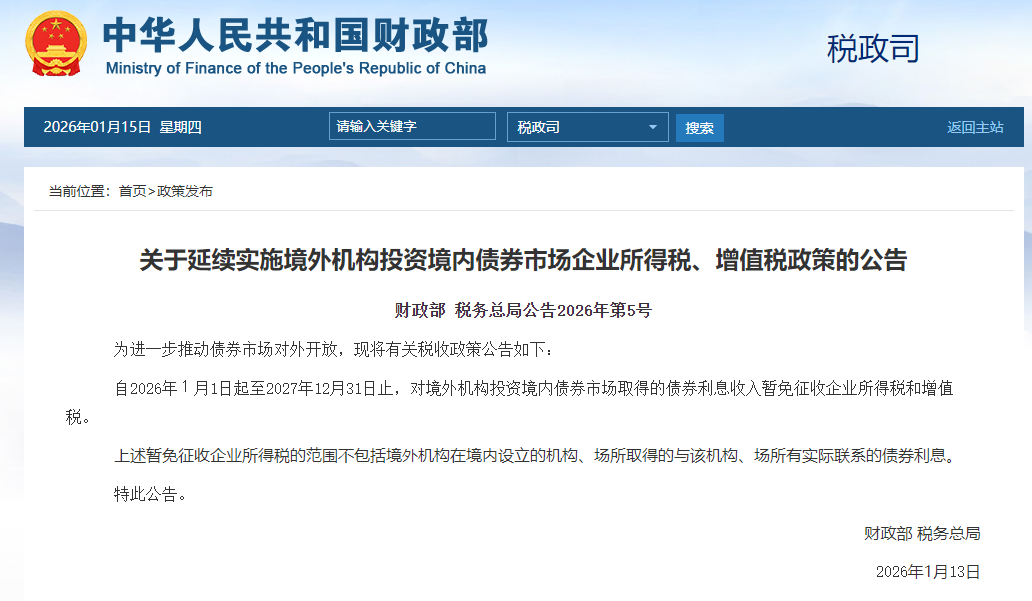 上证报中国证券网讯据财政部1月15日消息,财政部、税务总局发布关于延续实施境外机构投资境内债券市场企业所得税、增值税政策的公告。自2026年1月1日起至2027年12月31日止,对境外机构投资境内债券市场取得的债券利息收入暂免征收企业所得税和增值税。上述暂免征收企业所得税的范围不包括境外机构在境内设立的机构、场所取得的与该机构、场所有实际联系的债券利息。