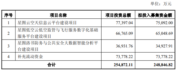 中科星图于8月22日发布的《2025年度向特定对象发行A股股票预案(修订稿)》显示,本次向特定对象发行股票募集资金总额不超过人民币248,846.82万元(含本数),扣除相关发行费用后的募集资金净额拟用于以下项目:星图云空天信息云平台建设项目、星图低空云低空监管与飞行服务数字化基础服务平台建设项目、星图洛书防务与公共安全大数据智能分析平台建设项目、补充流动资金。