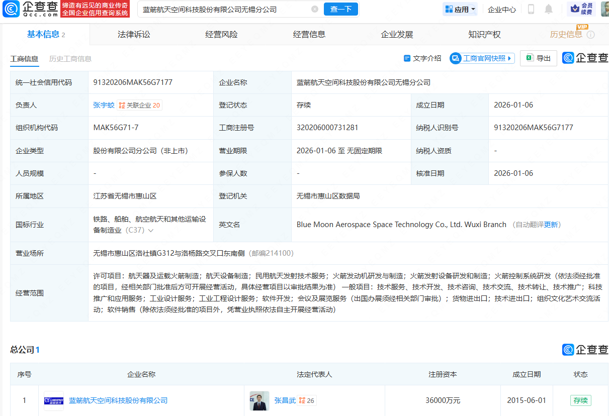 近日,蓝箭航天空间科技股份有限公司无锡分公司成立,负责人为张宇蛟,经营范围包含:航天器及运载火箭制造;航天设备制造;民用航天发射技术服务;火箭发动机研发与制造等。